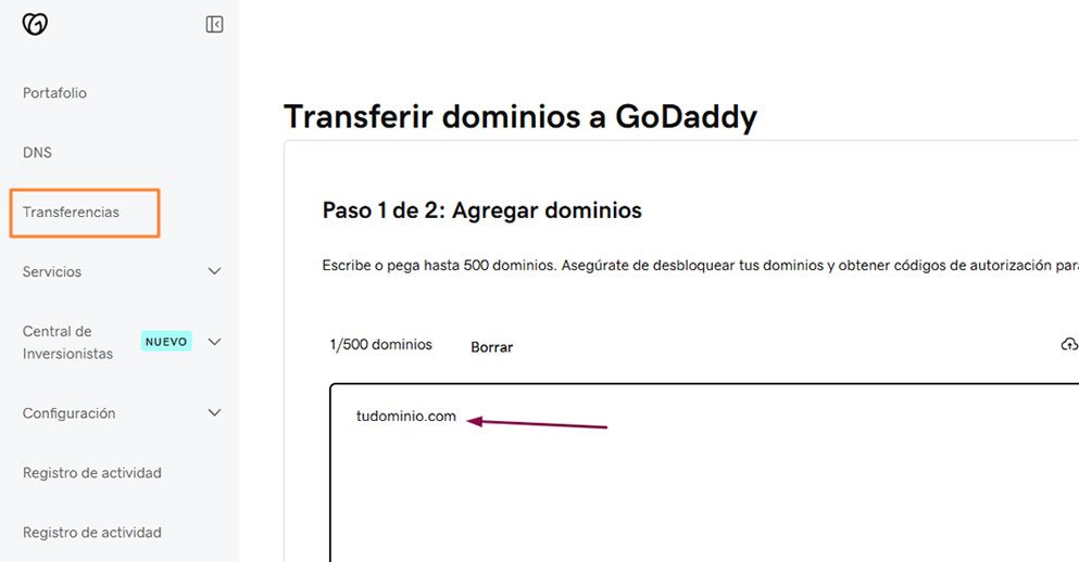 Ve a la opción Transferir un dominio o https://dcc.godaddy.com/control/transfers