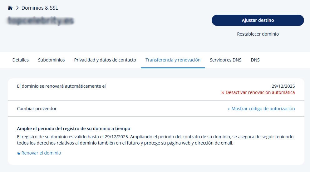 Desde ahí ya podrás gestionar DNS, renovaciones, redirecciones, etc.